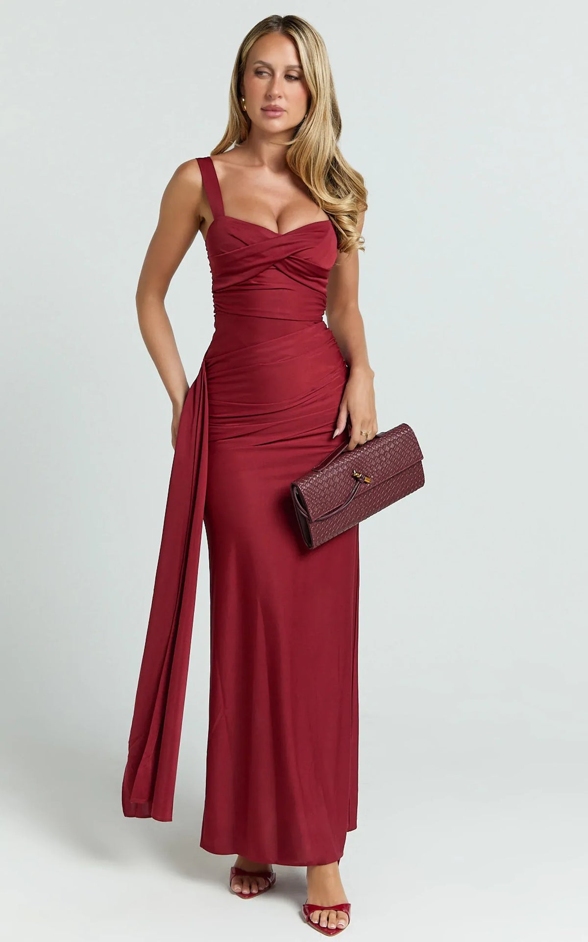 This evening dress features a mermaid silhouette. It has a one-shoulder neckline with sleeveless design. The draped-back detail, floor-length cut, and plus-size option bring captivating charm, making it ideal for evening events. The ruched bodice and flowing drape create a alluring and sophisticated evening look.