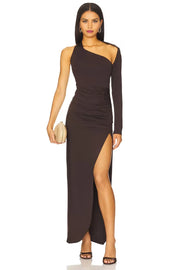 This evening dress features a sheath silhouette that elegantly contours the body. It has a one-shoulder neckline for a bold and distinctive look, a single long sleeve that adds a touch of drama, and an open-back design that exudes allure. The floor-length cut, paired with a high side slit, brings glamour and movement, making it a perfect choice for formal galas, red-carpet events, and other upscale occasions, exuding a sense of mesmerizing charm.