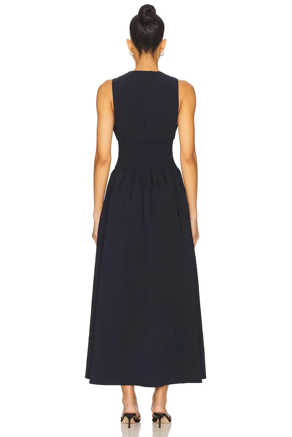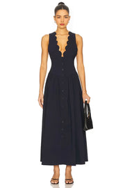 This evening dress features an A-line silhouette that flows elegantly. It has a scallop neckline with a deep V detail for a sweet and sophisticated look, sleeveless design for a chic appearance, and a smocked-back that ensures a tailored fit. The midi length offers balanced elegance, making it perfect for cocktail parties, formal dinners, and other upscale events, exuding a sense of refined charm.