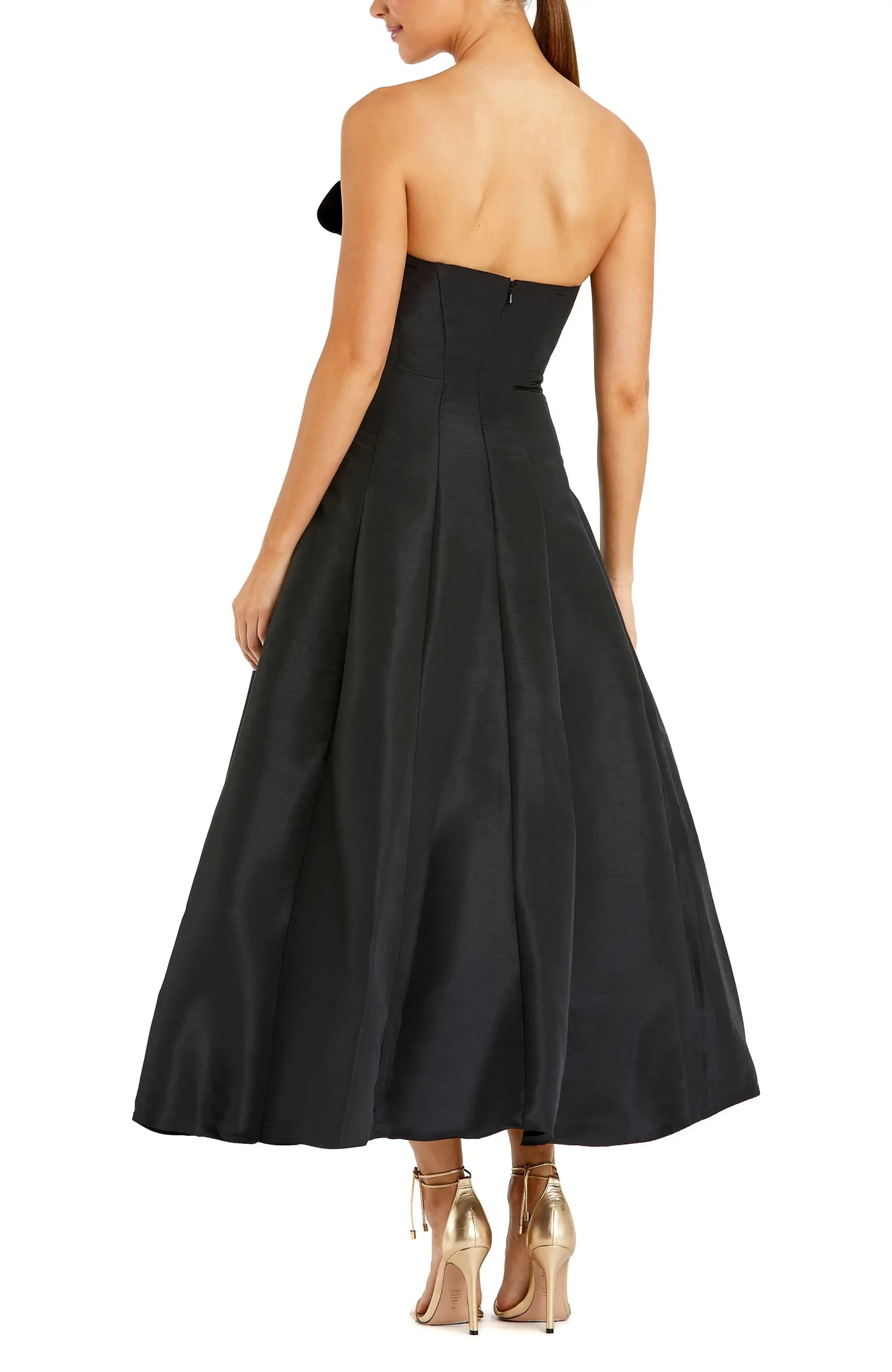 This charming dress features an A line silhouette, flowing gently from the bust for a sweet and lovely look. The strapless design adds a touch of romantic charm. With a sleeveless cut, it keeps you cool and stylish. The zipper back detail ensures a secure and seamless fit, and the midi length skirt makes for a truly charming and unforgettable appearance, perfect for evening events.