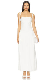 This evening dress features an A-line silhouette that flows elegantly. It has a strapless neckline for a classic and alluring look, tie straps that add a delicate detail, and a ruched-back design that ensures a tailored fit. The midi length offers balanced elegance, making it perfect for cocktail parties, formal dinners, and other upscale events, exuding a sense of sweet sophistication.