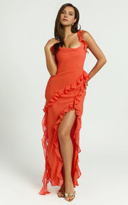 This evening dress features a mermaid silhouette that offers a sleek and figure-hugging fit. The cowl neck design brings a retro and charming touch, while the sleeveless style provides a chic and effortless look. The ruffled-back accents add elements of alluring charm, enhancing the dress’s overall appeal. With a floor-length design, it’s ideal for evening events, ensuring the wearer looks charming and confident.