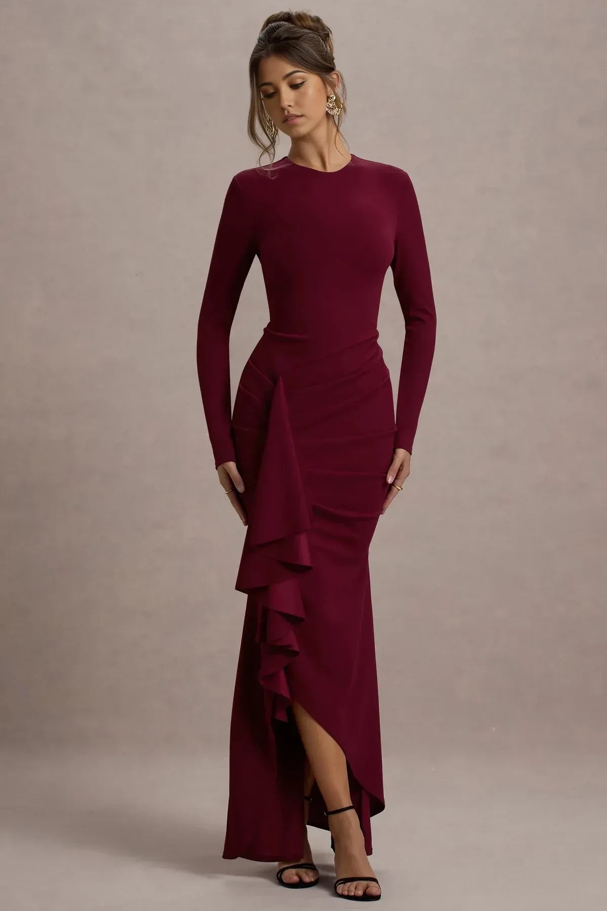 This dress features a charming mermaid silhouette with a crew neck, long sleeves, and ruffled-side detailing that offer a sophisticated and fashionable look. The floor-length cut adds a touch of elegance, making it perfect for evening events, ensuring you look stylish and confident.