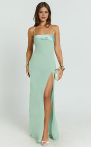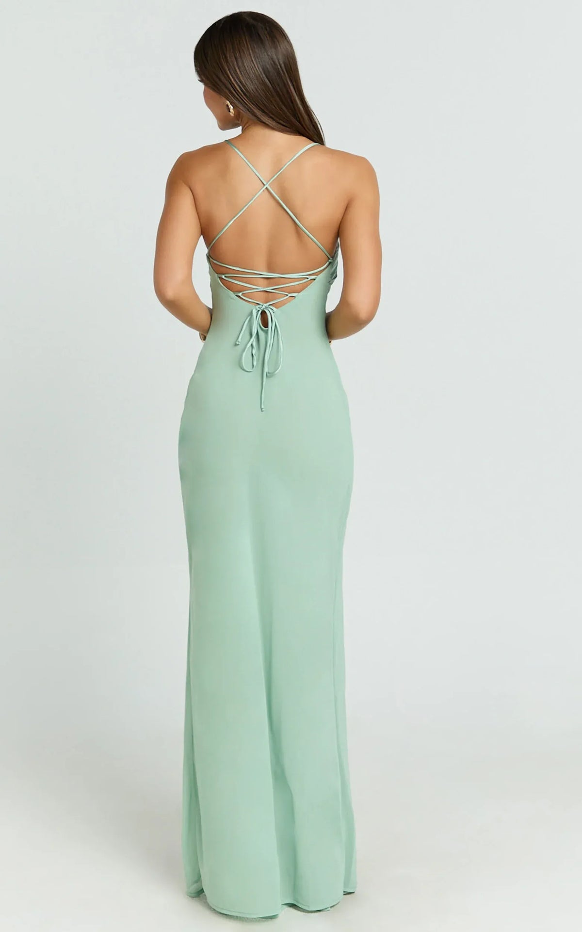 This evening dress features a sheath silhouette that offers a sleek and figure-hugging fit. The cowl neck design brings a retro and charming touch, while the sleeveless style provides a chic and effortless look. The lace-up-back accents add elements of alluring charm, enhancing the dress’s overall appeal. With a floor-length design, it’s ideal for evening events, ensuring the wearer looks charming and confident.