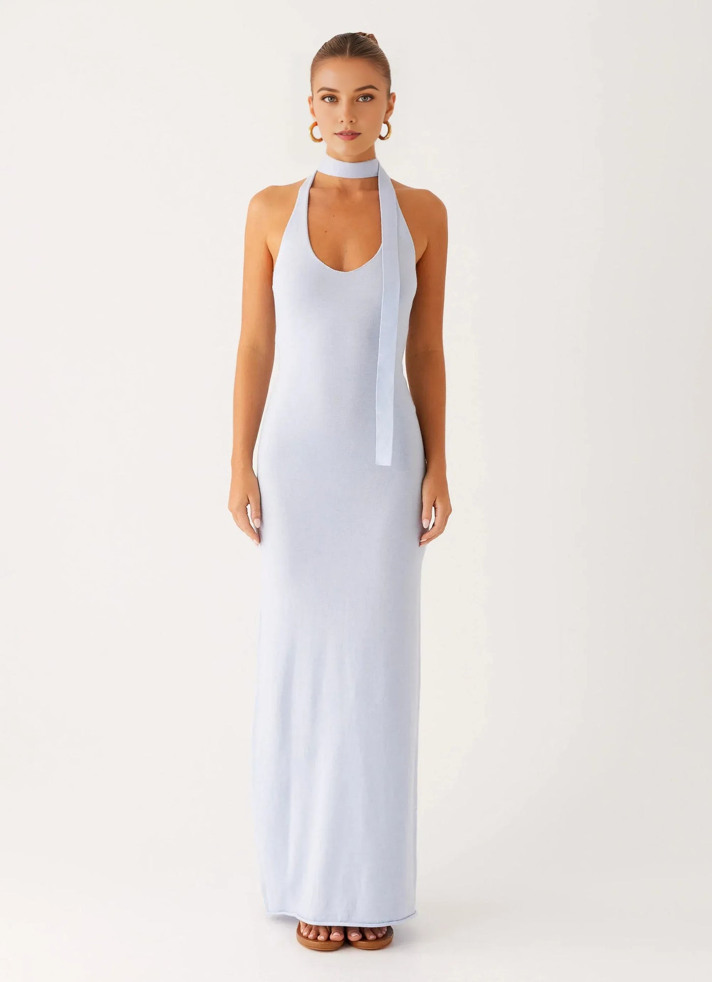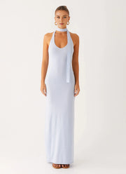 This evening dress features a sheath silhouette that offers a sleek and figure-hugging fit. The halter neck design brings a romantic and charming touch, while the sleeveless style provides a chic and effortless look. The tie-back accents add elements of alluring charm, enhancing the dress’s overall appeal. With a floor-length design, it’s ideal for evening events, ensuring the wearer looks charming and confident.