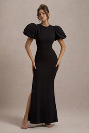This dress features a chic mermaid silhouette with a crew neck, puff sleeves, and a keyhole-back detailing that offer a sophisticated and fashionable look. The floor-length cut adds a touch of elegance, making it perfect for evening events, ensuring you look stylish and confident.