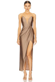 This dress features a chic mermaid silhouette with a strapless design, a plunging neck, a ruched slit, and a floor-length cut that offer a sophisticated and fashionable look. It’s perfect for evening events, ensuring you look stylish and confident.