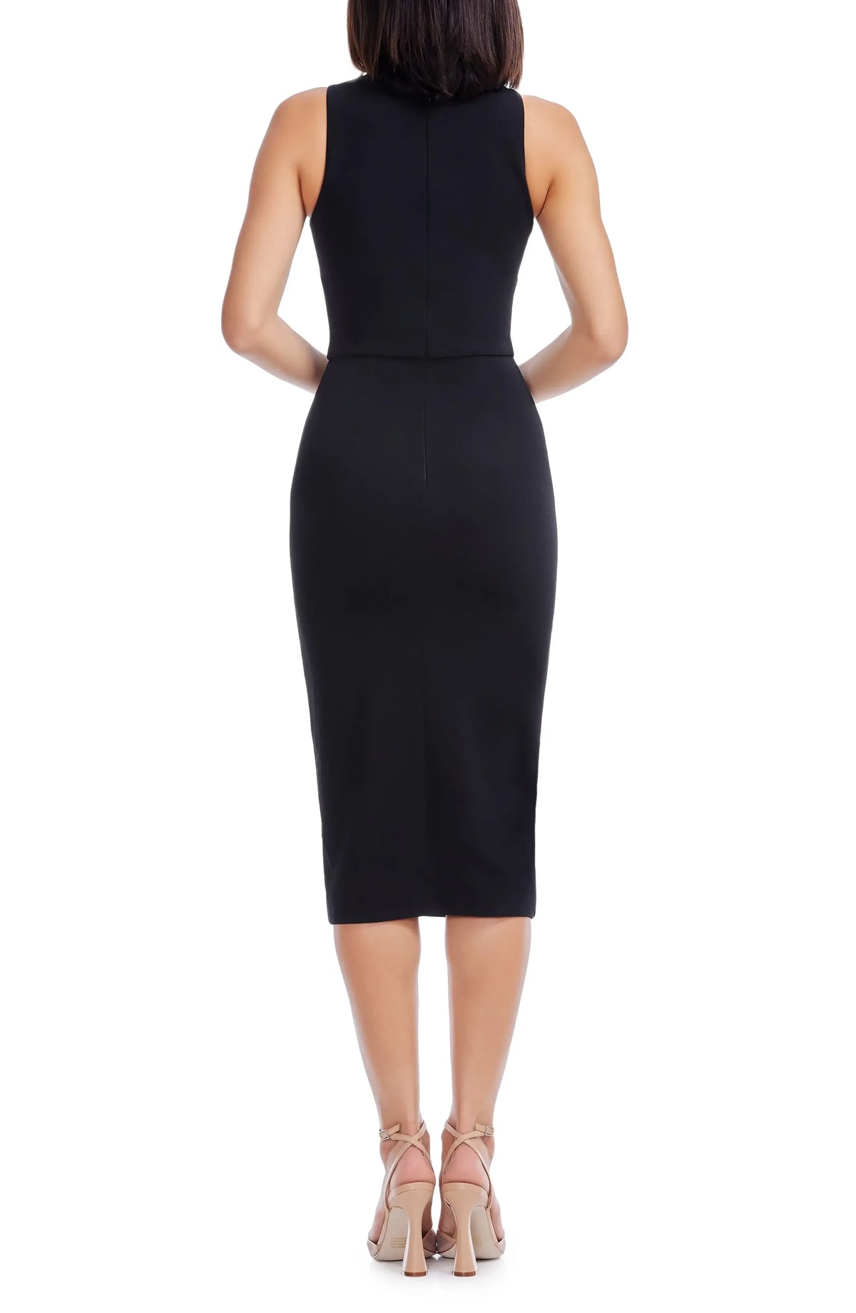 This chic dress features a sheath silhouette, hugging the body to highlight curves. The crew neck design brings a classic and timeless charm. With a sleeveless cut, it adds a touch of elegance. The plain back detail creates a sleek and simple look, and the midi length skirt, along with the side ruffle, makes for a truly chic and unforgettable appearance, perfect for evening events.