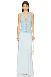 This dress features a chic sheath silhouette with a halter neck, sleeveless style, rosette detailing, open-back detailing, and a floor-length cut that offer a sophisticated and fashionable look. It’s perfect for evening events, ensuring you look stylish and confident.