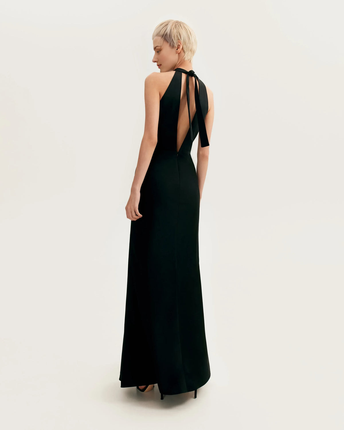 This dress features a chic sheath silhouette with a halter neck, sleeveless style, and a tie-back that offer a sophisticated and fashionable look. The floor-length cut adds a touch of elegance, making it perfect for evening events, ensuring you look stylish and confident.