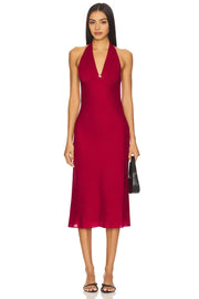 This evening dress features a sheath silhouette. It has a halter neckline with a sleeveless design. The tie-back style adds a trendy charm, and the midi-length cut is perfect for formal events. Flowy fabric and open-back detail create a fashionable and sophisticated evening look.