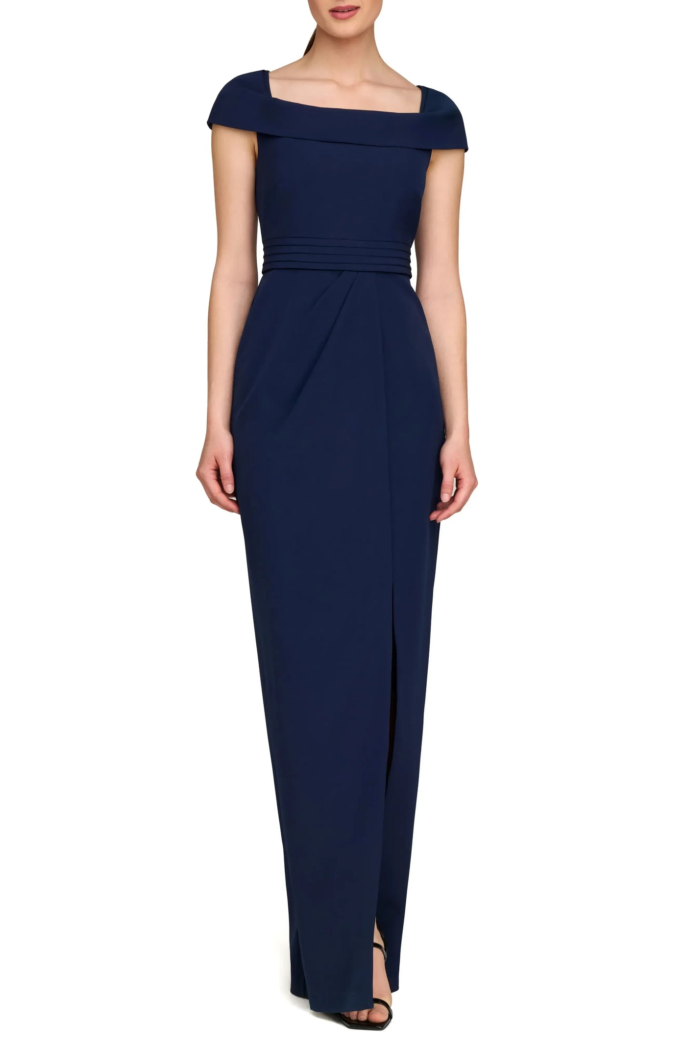 This chic dress features a sheath silhouette, hugging the body gracefully for a stylish and charming look. The off shoulder design adds a touch of elegant allure. With cap sleeves, it offers both style and a bit of coverage. The zipper back detail ensures a secure and seamless fit, and the floor length skirt, with its sleek draping and thigh high slit, makes for a truly chic and unforgettable appearance, perfect for evening events.