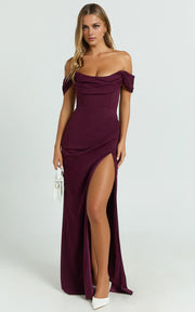 This evening dress features a sheath silhouette. It has an off-shoulder neckline with short sleeves. The draped bodice detailing, high slit, and floor-length cut (available in plus sizes) add chic charm, making it perfect for evening events. Structured fabric with elegant draped accents creates a chic and sophisticated evening look.