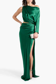 This evening dress features a sheath silhouette. It has a one-shoulder neckline with long sleeves. The cutout waist detailing, high slit, and floor-length cut (available in plus sizes) add chic charm, making it perfect for evening events. Silky fabric with elegant cutout accents creates a chic and sophisticated evening look.