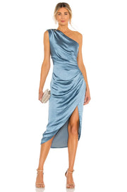 This dress features a chic sheath silhouette with a one-shoulder design, draped sleeve, a high-slit, and a midi-length cut that offer a sophisticated and fashionable look. It’s perfect for evening events, ensuring you look stylish and confident.