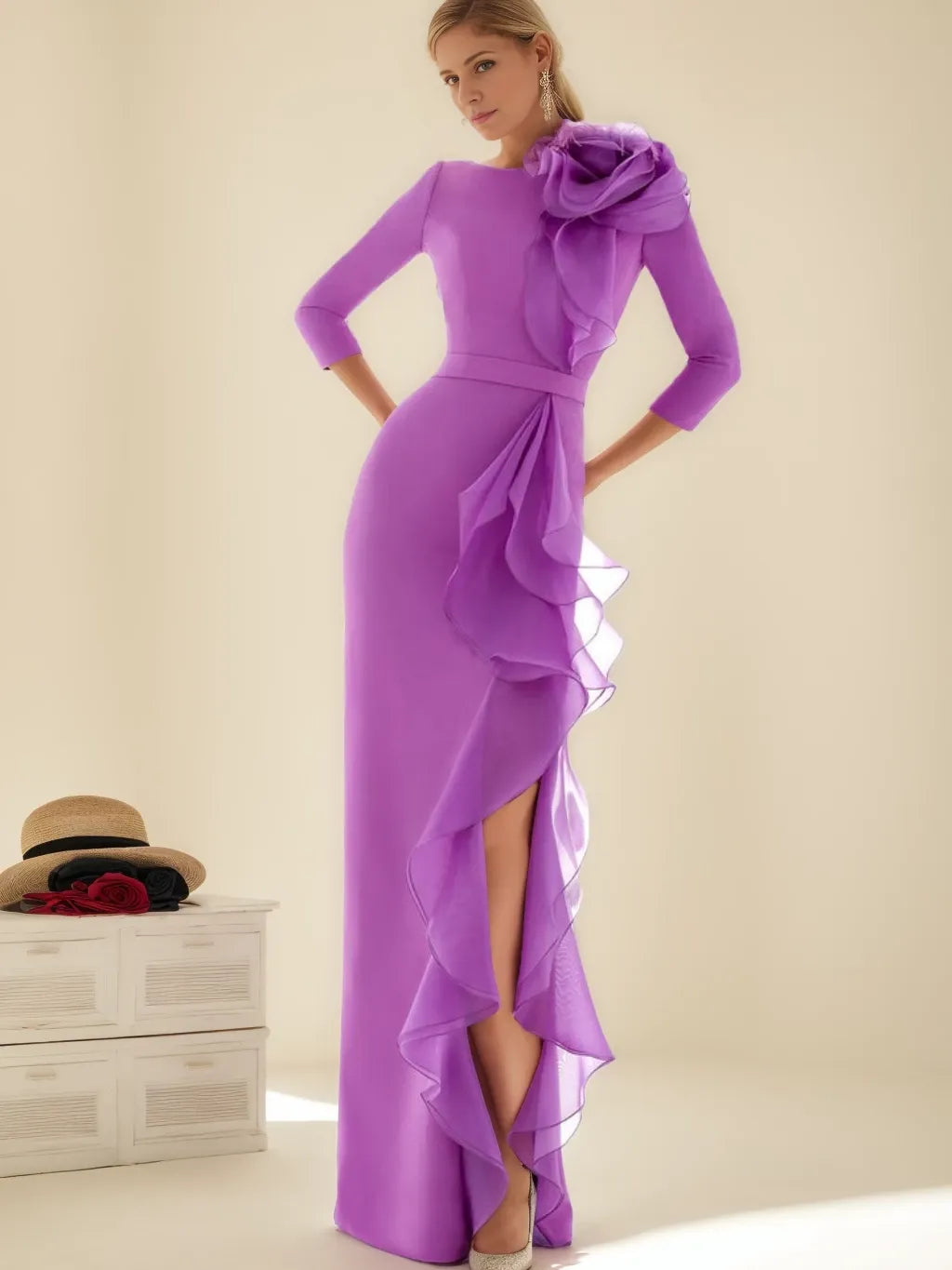 This elegant evening dress features a column silhouette with a jewel neckline, offering a refined and flattering fit. The long sleeves and floor-length design provide graceful coverage, while delicate ruffles add a touch of sophistication and movement. Perfect for formal occasions, this dress combines classic style with subtle detailing to ensure a timeless and polished look.