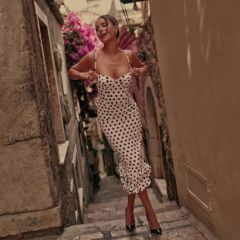 This long summer dress features a charming dot pattern with a sweetheart neckline and delicate spaghetti straps, creating a flattering sheath silhouette. Its elegant design makes it perfect for a variety of occasions, including proms, parties, cocktail events, homecomings, and evening gatherings. The lightweight fabric ensures comfort and ease of movement, making it a sophisticated yet practical choice for warm-weather celebrations.
