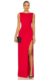 This evening dress features a sheath silhouette. It has a boat neckline with a sleeveless design. The draped-cutout-back style adds a bold charm, and the floor-length cut is perfect for formal events. High-slit detail and structured fit create a striking and sophisticated evening look.