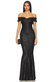 This evening dress features a mermaid silhouette that elegantly flares at the hem. It has an off-shoulder neckline with ruffle detailing for a glamorous look, short ruffle sleeves for a chic appearance, and a solid back that ensures a polished finish. The floor-length cut, adorned with shimmering details, brings a sense of captivating sparkle, making it a perfect choice for formal galas, red-carpet events, and other upscale occasions, exuding a sense of radiant allure.
