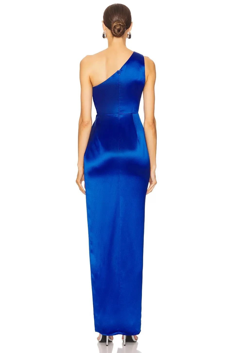 This evening dress features a sheath silhouette that elegantly accentuates the figure. It has a one-shoulder neckline for a bold and distinctive look, sleeveless design for a sleek appearance, and a zipper-back for easy wear. The floor-length cut, paired with a dramatic side slit, adds a touch of glamour and movement, making it a perfect choice for formal galas, red-carpet events, and other upscale occasions, exuding a sense of captivating allure.