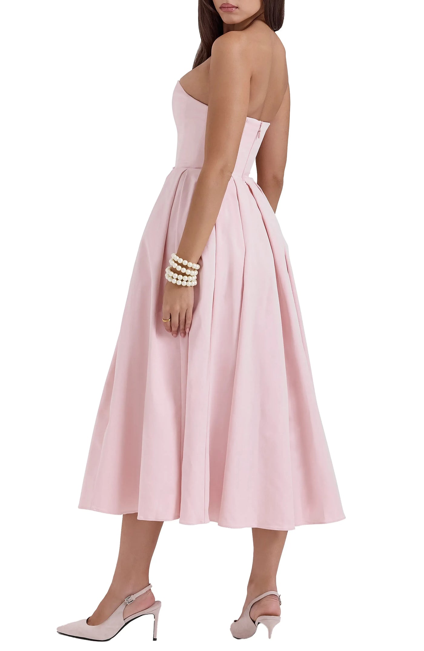 This delicate dress features a ball gown silhouette, with a voluminous skirt that creates a dreamy and lovely look. The strapless design adds a touch of romantic charm. With a sleeveless cut, it keeps you cool and stylish. The zipper back detail ensures a secure and seamless fit, and the midi length skirt makes for a truly delicate and unforgettable appearance, perfect for evening events.
