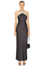 This evening dress features a sheath silhouette. It has a halter neckline with a sleeveless design. The tie-back style adds a gentle charm, and the floor-length cut is perfect for formal events. Lace detailing and a sleek fabric create a refined and feminine evening look.