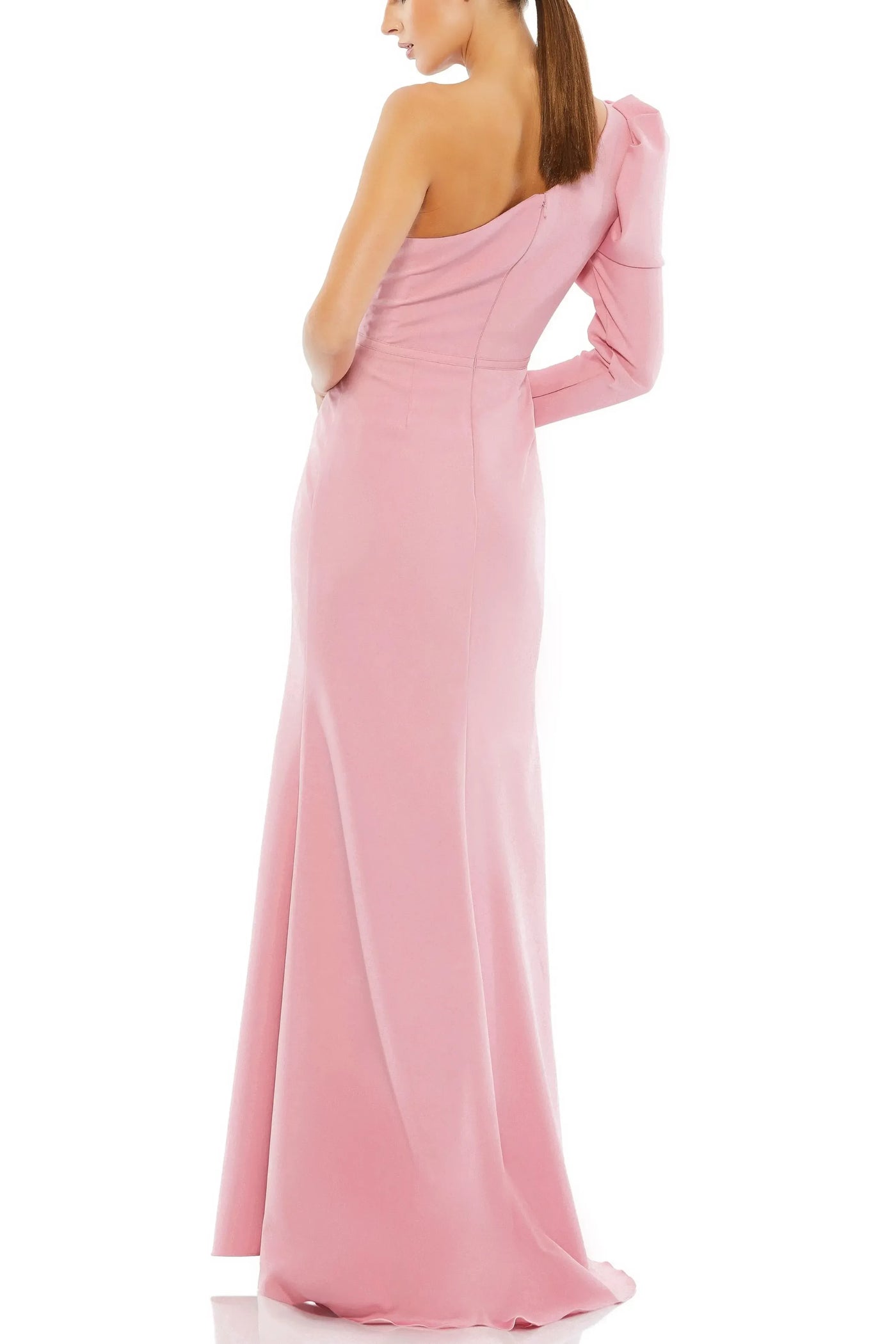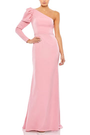 This delightful dress features a mermaid silhouette, hugging the body gracefully and flaring at the bottom for a sweet and charming look. The one shoulder design adds a touch of unique allure. With long sleeves, it offers a stylish balance of coverage and elegance. The open back detail ensures a lovely and seamless fit, and the floor length skirt makes for a truly delightful and unforgettable appearance, perfect for evening events.