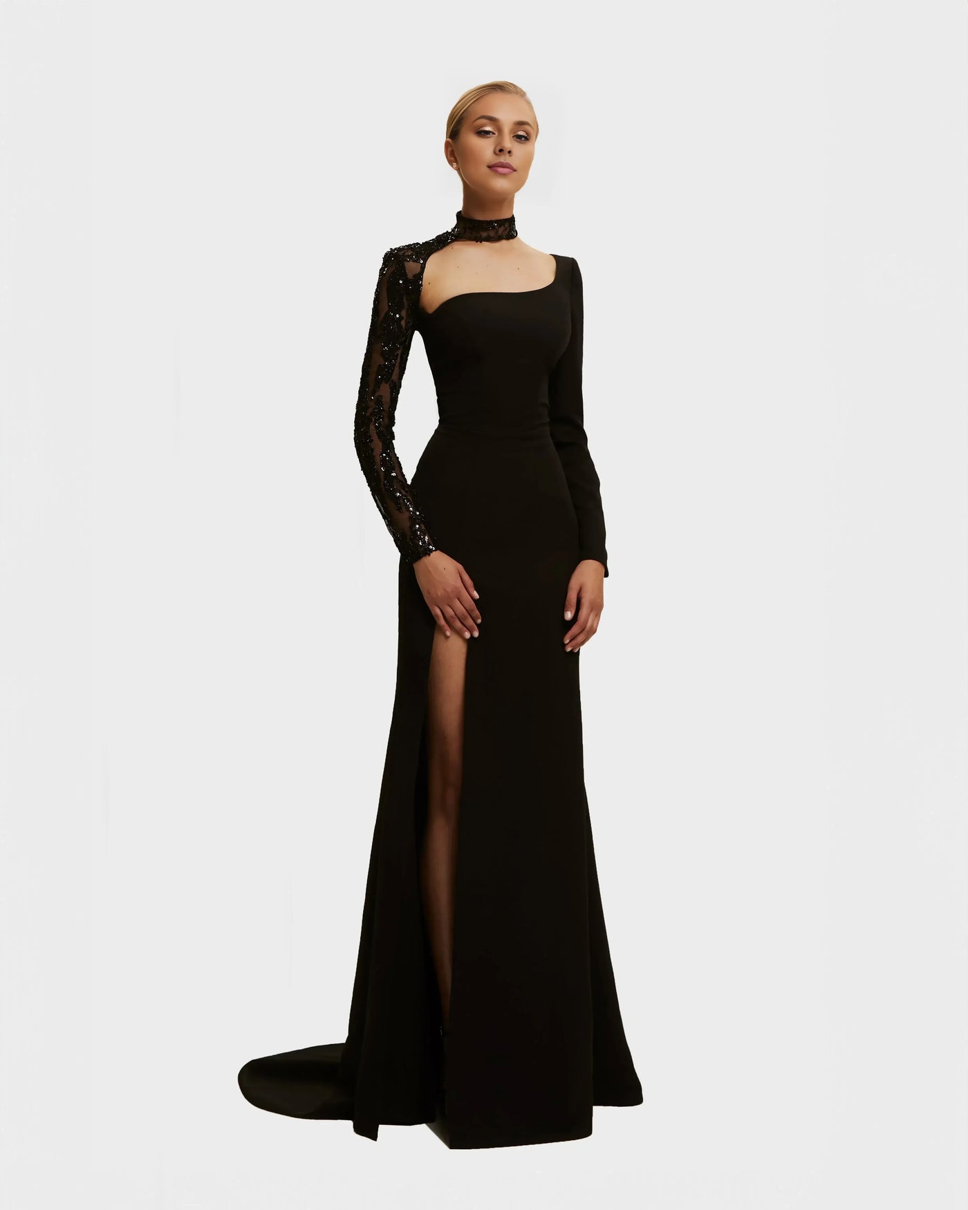 This dress features a dramatic mermaid silhouette with an asymmetric neck, embellished sleeves, and a zipper-back that offer a sophisticated and fashionable look. The floor-length cut adds a touch of elegance, making it perfect for evening events, ensuring you look stylish and confident.