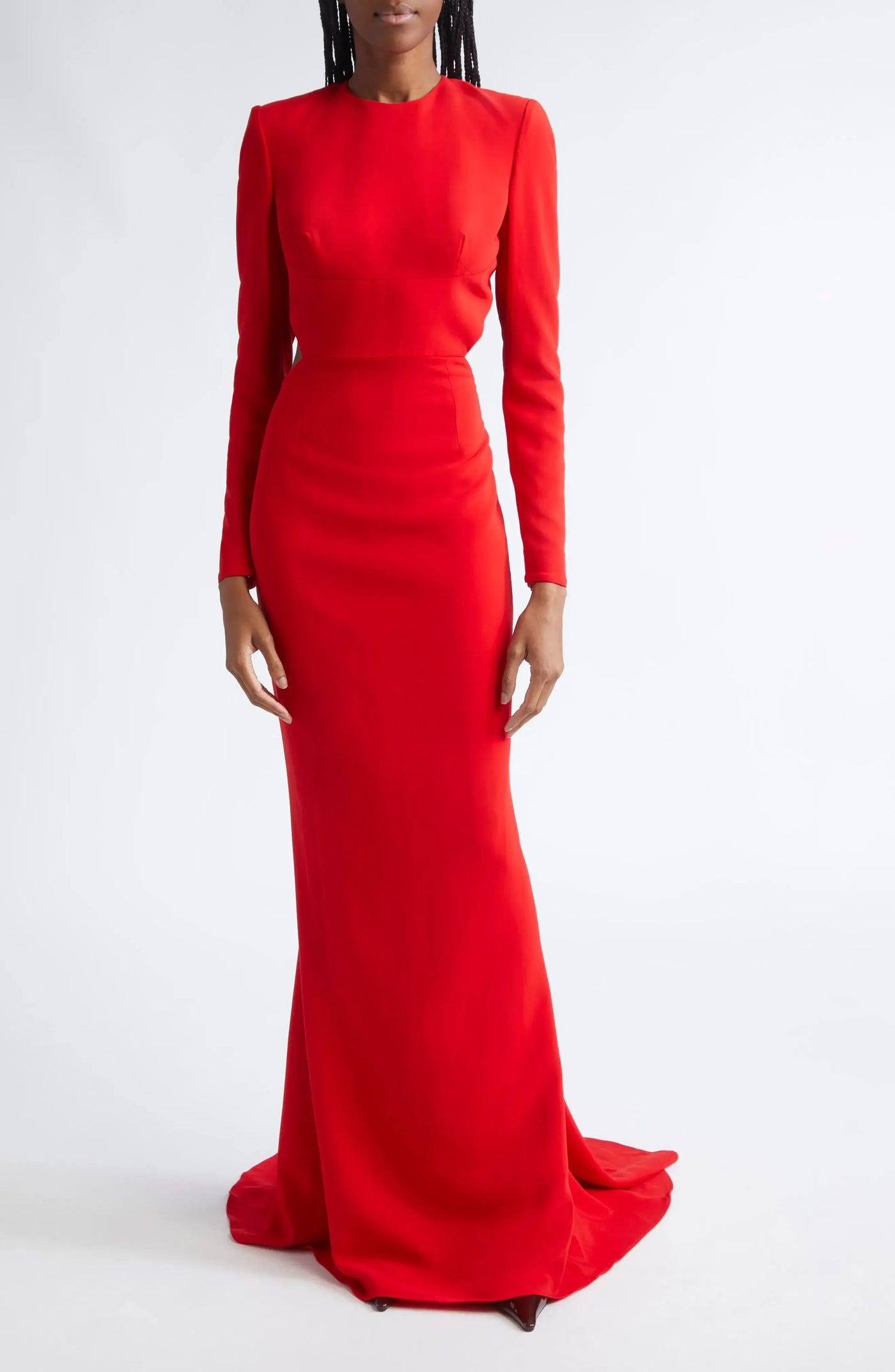 This dramatic dress features a sheath silhouette, hugging the body gracefully for a bold and striking look. The crew neck design adds a touch of classic charm. With long sleeves, it offers both style and coverage. The open back detail creates a captivating and alluring look, and the floor length skirt makes for a truly dramatic and unforgettable appearance, perfect for evening events.