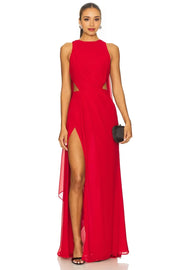 This evening dress features a sheath silhouette that elegantly contours the body. It has a high neckline with a draped detail for a refined look, sleeveless design for a chic appearance, and a cutout-accent with a high-slit for a tailored fit. The floor-length cut, crafted from a flowy chiffon fabric, is perfect for formal galas, red-carpet events, and upscale occasions, exuding a sense of striking drama.