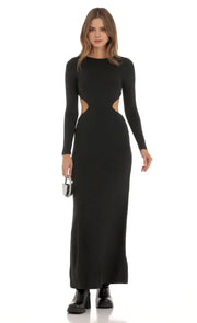 This edgy dress features a sheath silhouette, offering a sleek and body hugging look. The crew neckline exudes classic charm, while the long sleeves add a touch of modern elegance. The cut out back detail brings a bold and alluring element, and the floor length skirt creates a truly edgy and unforgettable style, perfect for evening events.