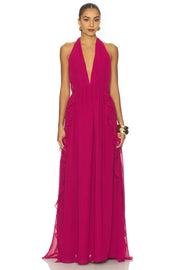 This dress features an elegant A-line silhouette with a halter neck, sleeveless style, ruffled open-back detailing, and a floor-length cut that offer a sophisticated and fashionable look. It’s perfect for evening events, ensuring you look stylish and confident.