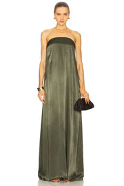 This evening dress features an A-line silhouette that flows elegantly. It has a strapless neckline with a sleek design for a refined look, sleeveless style for a chic appearance, and a solid-back with a zipper closure for a tailored fit. The floor-length cut, crafted from a lustrous fabric, is perfect for formal galas, red-carpet events, and upscale occasions, exuding a sense of timeless elegance.