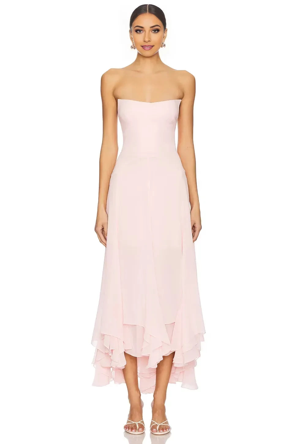 This evening dress features a flowing A-line silhouette. The strapless neckline elegantly showcases the shoulder and neck lines, while the sleeveless design exudes a sleek look. With a zipper-back for easy wear, the midi length is paired with a layered skirt that moves gracefully as you walk. It’s a sophisticated choice for dinners, formal parties, and other occasions, highlighting gentle charm and fashion sense.