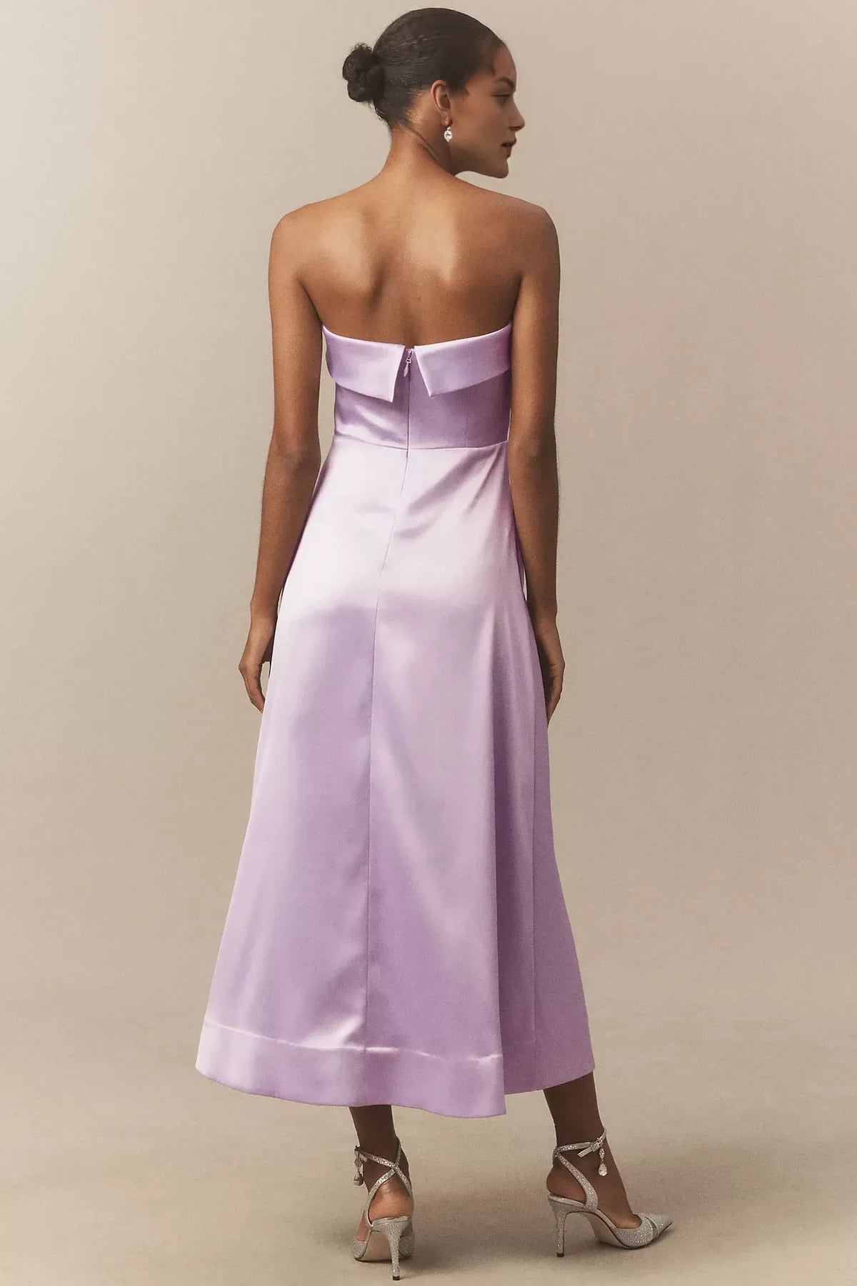 This elegant dress features an A line silhouette, offering a graceful and flowing look. The strapless neckline exudes charming allure, while the sleeveless design adds a touch of delicate elegance. The zipper back ensures a secure fit, and the midi length skirt creates a truly elegant and unforgettable style, perfect for evening events.