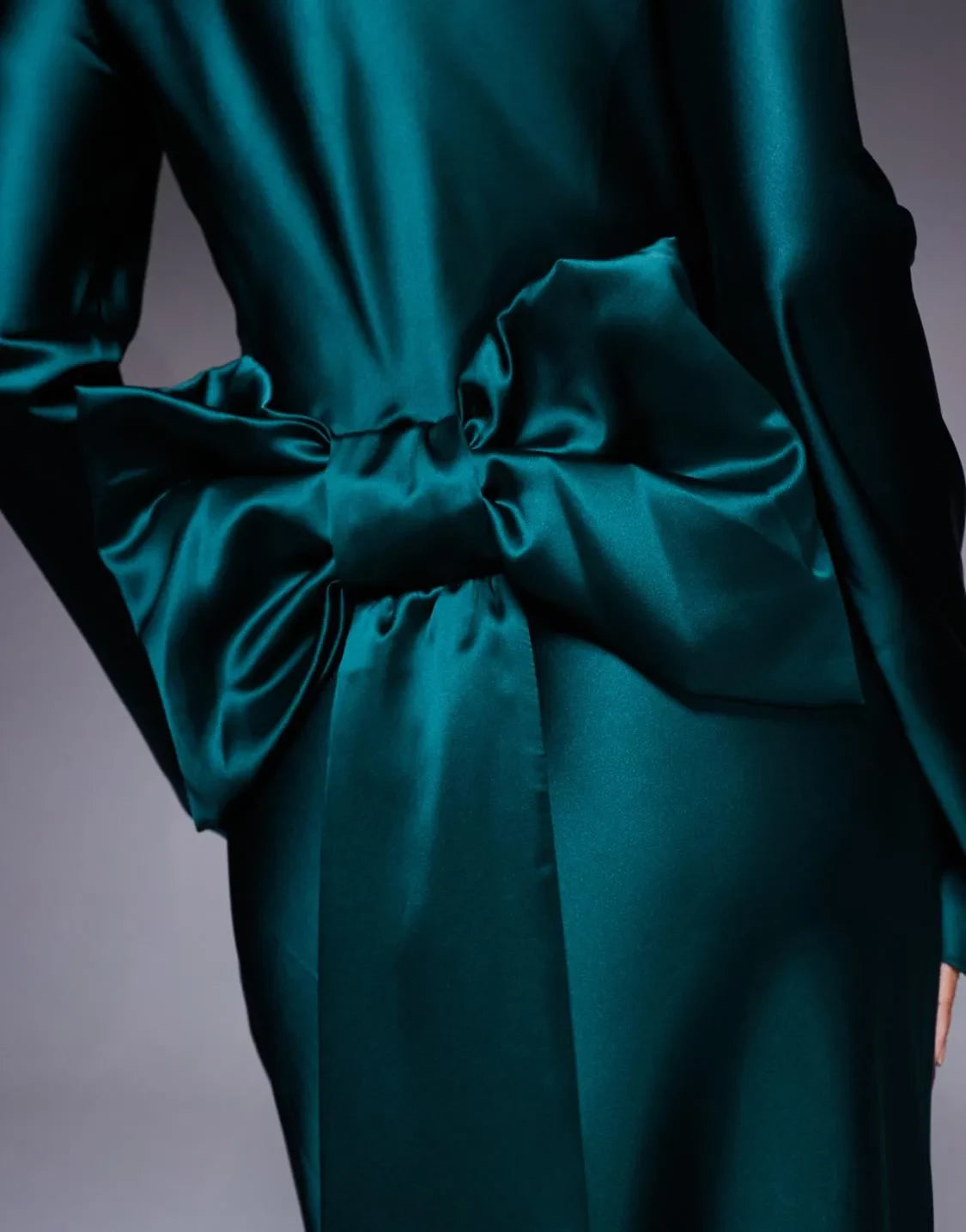 This elegant dress features a mermaid silhouette, offering a curve hugging and glamorous look. The high neckline exudes refined charm, while the long sleeves add a touch of sophistication. The bow back detail brings a sweet and stylish element, and the floor length skirt creates a truly elegant and unforgettable style, perfect for evening events.