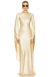 This dress features an elegant sheath silhouette with a boat neck, dramatic long sleeves, open-back detailing, and a floor-length cut that offer a sophisticated and fashionable look. It’s perfect for evening events, ensuring you look stylish and confident.
