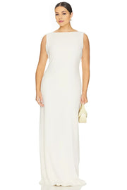 This evening dress features a sheath silhouette. It has a boat neckline with a sleeveless design. The zipper-back style adds a refined charm, and the floor-length cut is perfect for formal events. The deep V-back and sleek fabric create a poised and sophisticated evening look.