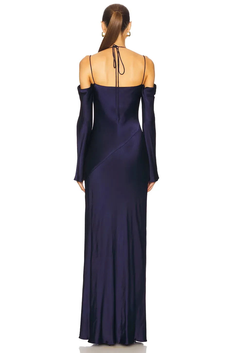 This evening dress features a sheath silhouette that beautifully flatters the figure. It has a cowl neckline for a touch of sophistication, cold-shoulder sleeves that add a trendy element, and a tie-back detail that ensures a tailored fit. The floor-length cut flows gracefully, making it a perfect choice for formal dinners, galas, and other upscale events, exuding a sense of refined elegance.