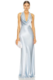 This dress features an elegant sheath silhouette with a halter neck, sleeveless style, draped open-back detailing, and a floor-length cut that offer a sophisticated and fashionable look. It’s perfect for evening events, ensuring you look stylish and confident.