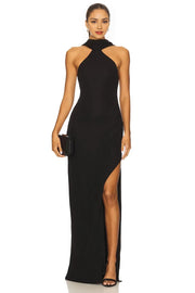 This dress features an elegant sheath silhouette with a halter neck, sleeveless style, draped open-back detailing, a slit front, and a floor-length cut that offer a sophisticated and fashionable look. It’s perfect for evening events, ensuring you look stylish and confident.