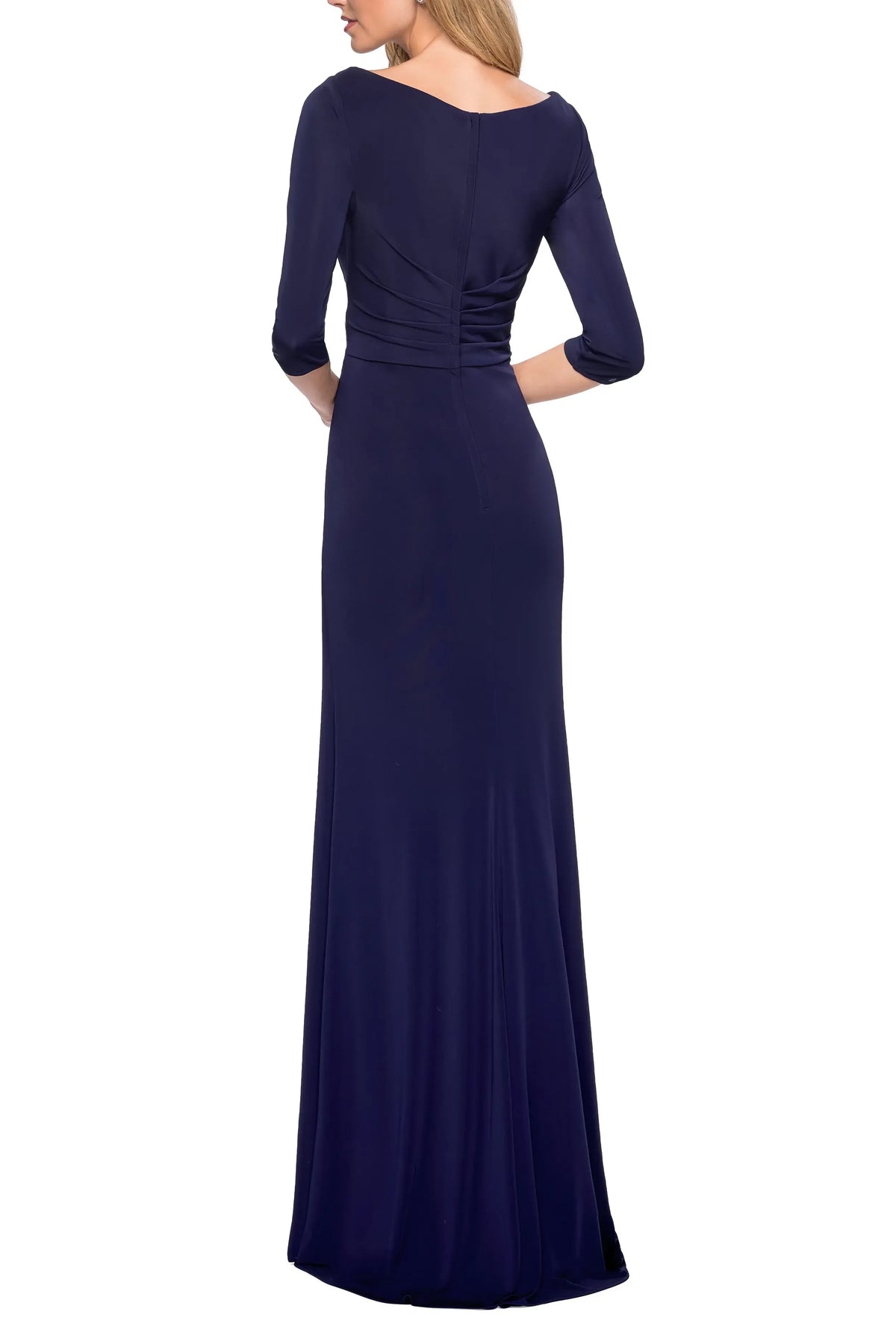 This elegant dress features a sheath silhouette, hugging the body gracefully for a refined and timeless look. The sweetheart neck design adds a touch of romantic allure. With 3/4 sleeves, it offers a bit of coverage while staying stylish. The ruched back detail ensures a lovely and seamless fit, and the floor length skirt makes for a truly elegant and unforgettable appearance, perfect for evening events.