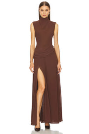 This dress features an elegant sheath silhouette with a turtleneck, sleeveless style, ruched back detailing, a slit front, and a floor-length cut that offer a sophisticated and fashionable look. It’s perfect for evening events, ensuring you look stylish and confident.