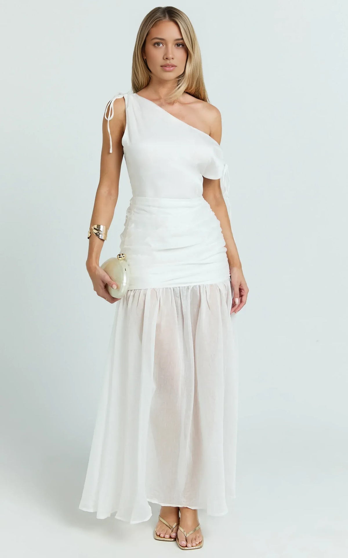 This evening dress features an A-line silhouette. It has a one-shoulder neckline with sleeveless design. The draped-back detail, floor-length cut, and plus-size option bring enchanting charm, making it ideal for evening events. The ruched bodice and flowing skirt create a graceful and alluring evening look.
