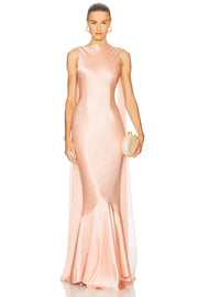 This evening dress features a mermaid silhouette that elegantly flares at the hem. It has a boat neckline with a sleek design for a refined look, sleeveless style for a chic appearance, and a cape-back with a tie detail that adds a touch of allure. The floor-length cut, crafted from a lustrous fabric, is perfect for formal galas, red-carpet events, and upscale occasions, exuding a sense of captivating enchantment.