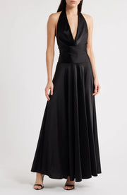 This glamorous dress features an A line silhouette, flowing gracefully from the waist for a dazzling and attractive look. The halter neck design adds a touch of chic charm. With a sleeveless cut, it keeps you cool and stylish. The open back detail ensures a striking and seamless fit, and the floor length skirt makes for a truly glamorous and unforgettable appearance, perfect for evening events.