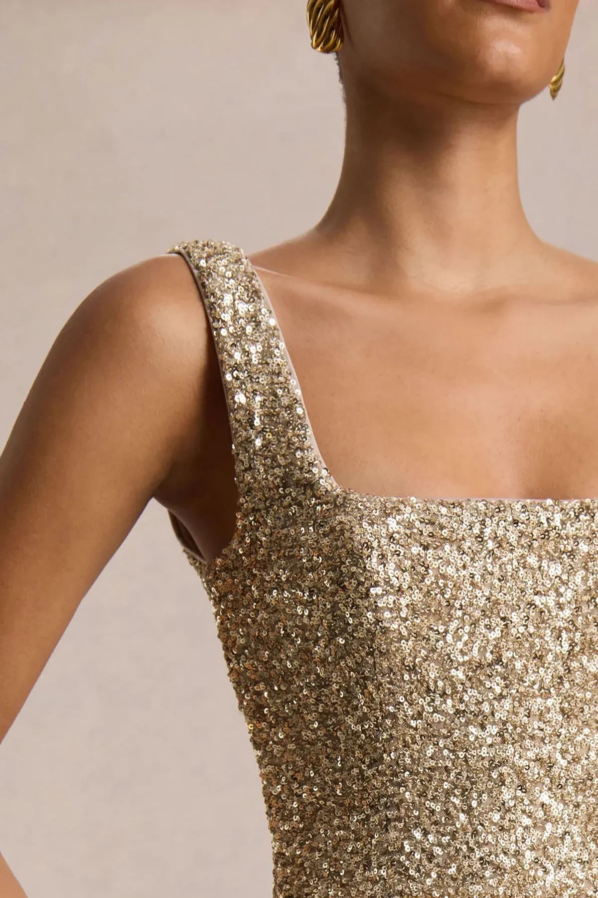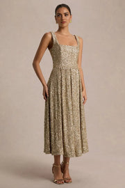 This dress features a glamorous A-line silhouette with a square neck, sleeveless design, and a zip-back that offer a sophisticated and eye-catching look. The midi-length cut adds a touch of elegance, making it perfect for evening events, ensuring you look stylish and confident.