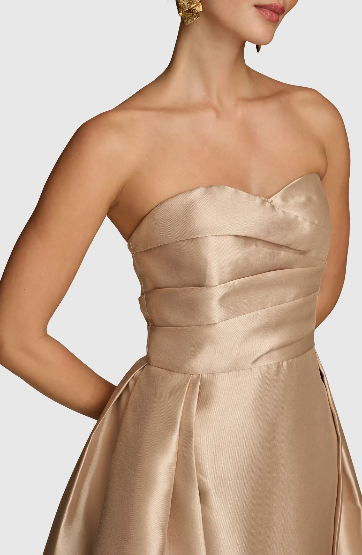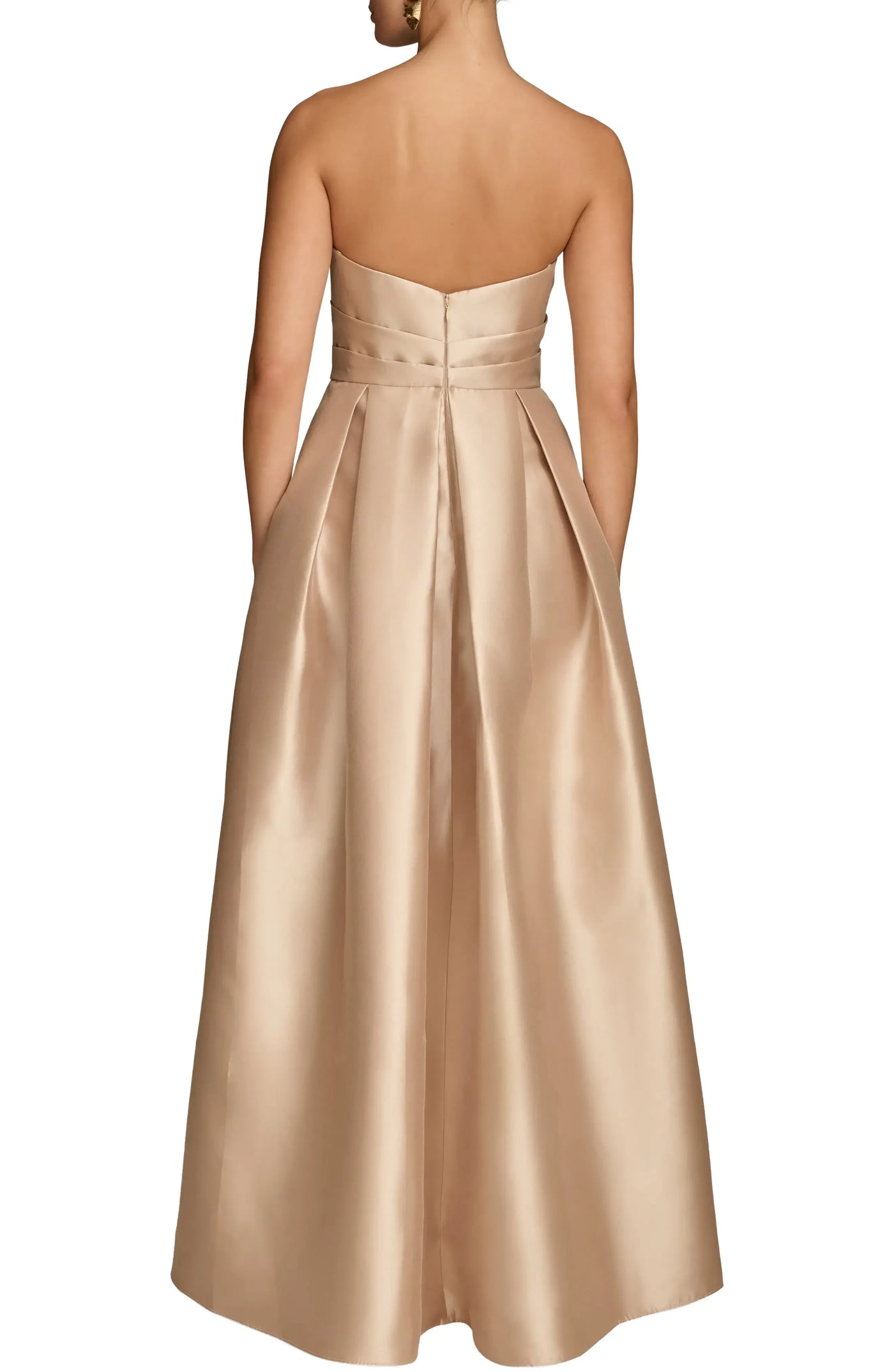 This glamorous dress features an A line silhouette, offering a flowing and voluminous fit. The strapless neckline gives off a romantic and alluring vibe, while the sleeveless design adds a touch of simplicity. The zipper back detail brings a practical and stylish element, and the floor length skirt, with its elegant drape, creates a truly glamorous and unforgettable look, perfect for evening events.