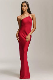 This glamorous dress features a mermaid silhouette, offering a curve hugging and dramatic look. The one shoulder neckline exudes alluring charm, while the sleeveless design adds a touch of modern grace. The draped back detail brings a unique and captivating element, and the floor length skirt creates a truly glamorous and unforgettable style, perfect for evening events.