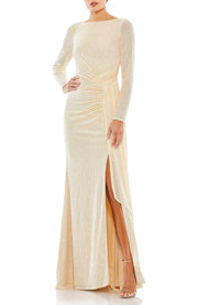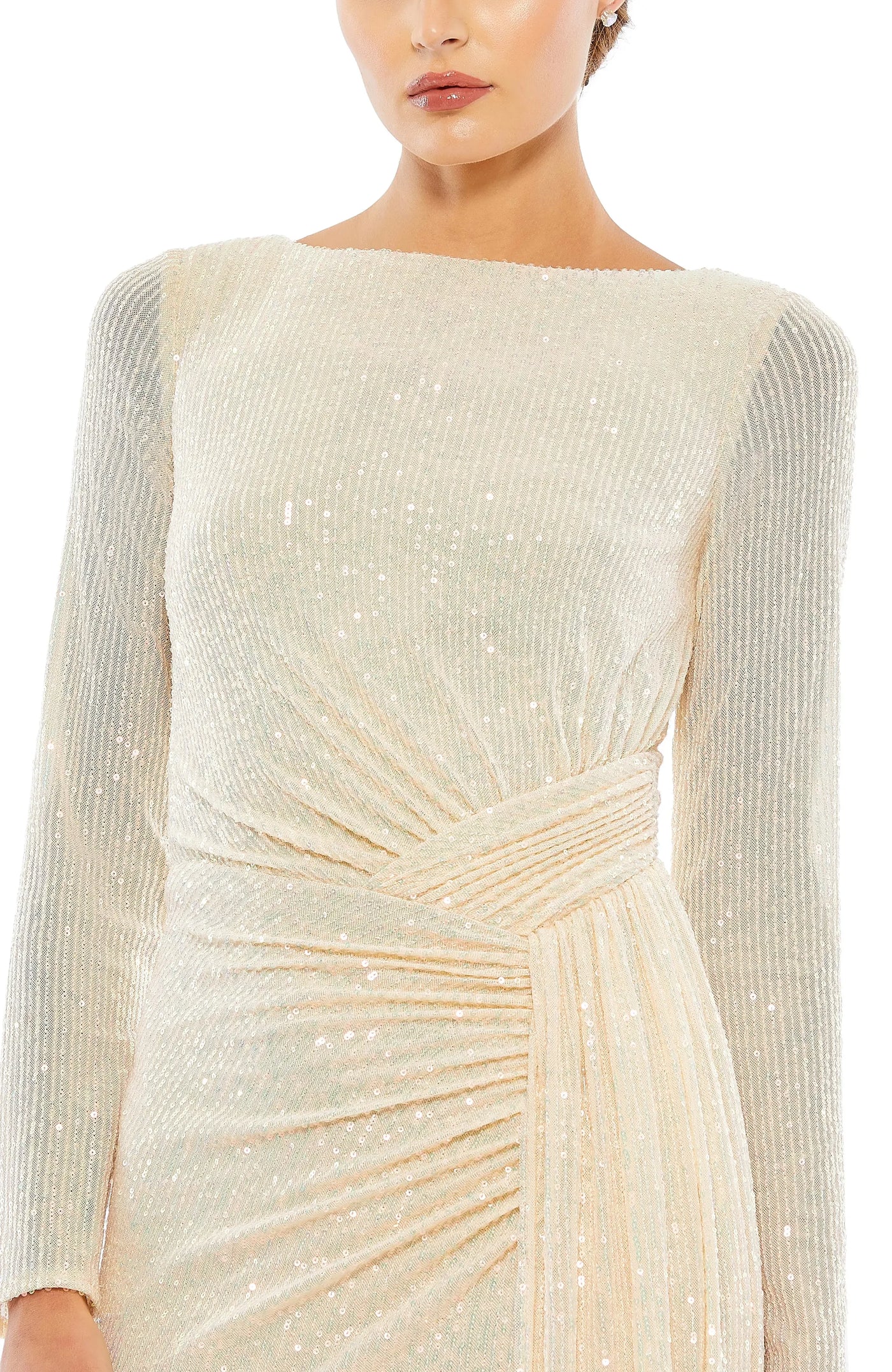 This glamorous dress features a sheath silhouette, hugging the body gracefully for a dazzling and captivating look. The boat neck design adds a touch of classic elegance. With long sleeves, it offers a warm and stylish appearance. The zipper back detail ensures a secure and seamless fit, and the floor length skirt, adorned with shimmering sequins and draped details, makes for a truly glamorous and unforgettable appearance, perfect for evening events.